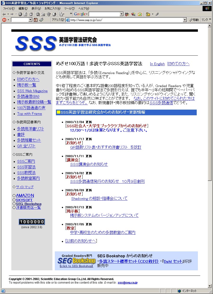 2003年12月22日午後5時頃、カウンターをつけた2002年3月6日から、1年9ケ月ほどで100万アクセスとなりました。
