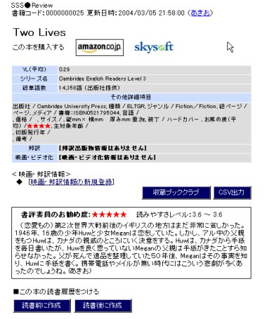 ※「この本を購入する」は、 amazon.co.jp へ直接リンクが繋がっています。こちらのリンクからご購入いただきますと、SSSへ紹介手数料が入る仕組みになっています。それらの収益は、SSSの活動費(論文のための調査費用、書評用の本の購入費、講演会・地方読書相談会の交通費、ホームページ運営、書評システム開発、全国オフ会へ交通費補助、多読指導を始めた学校への講師派遣費用など)に使われます。