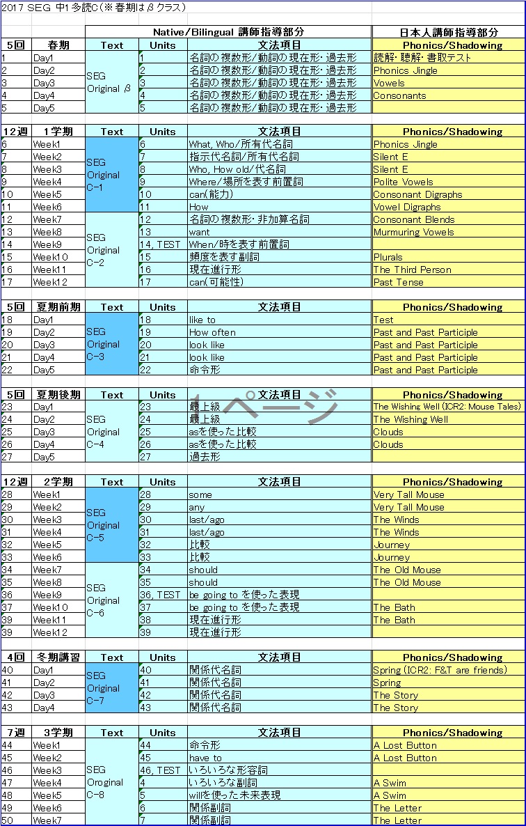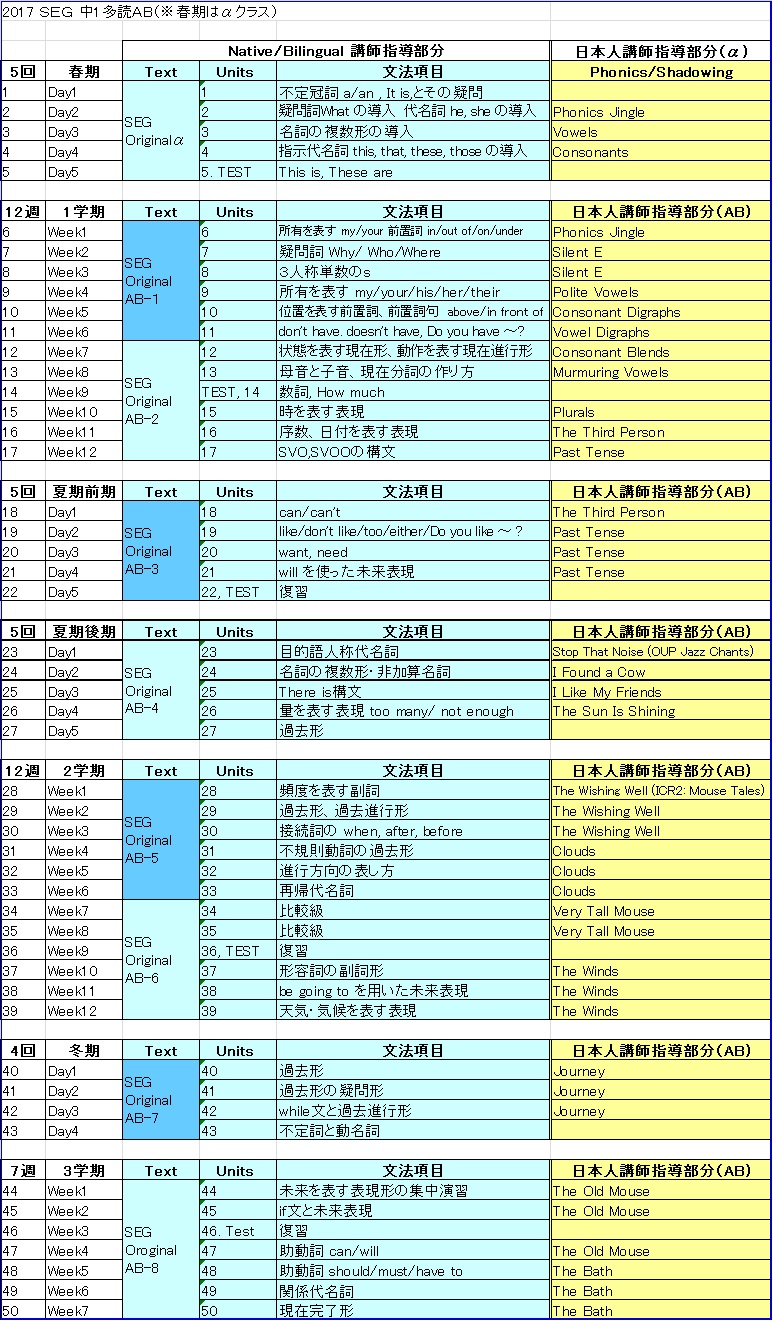 中1多読A/Bクラス進度予定表(春期は、αクラス)