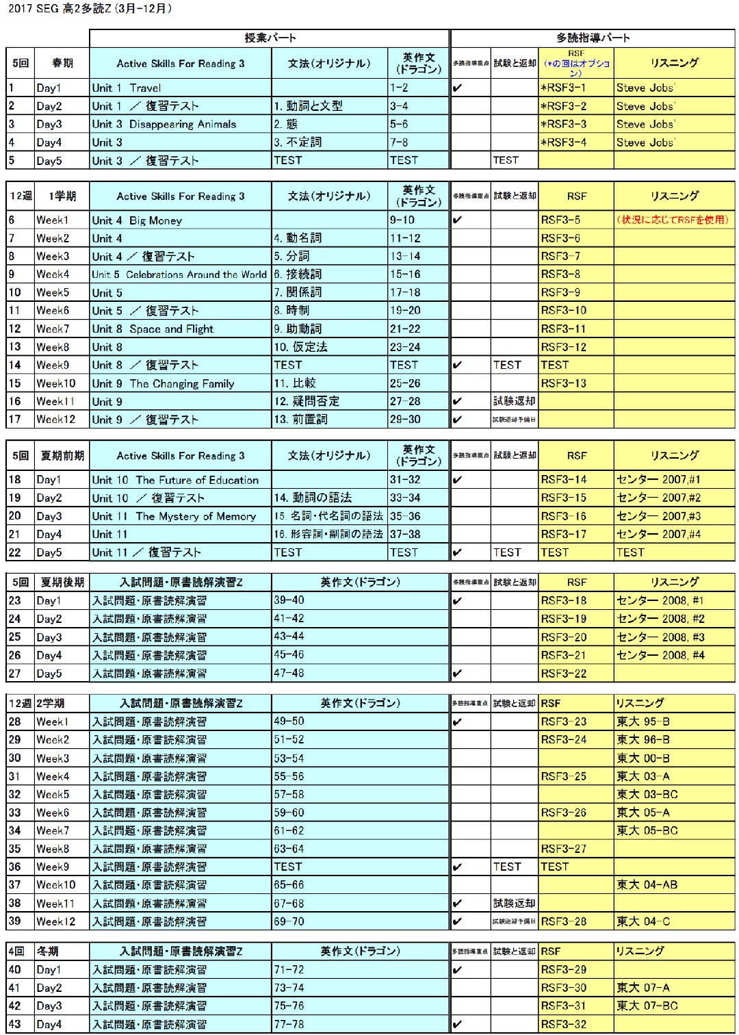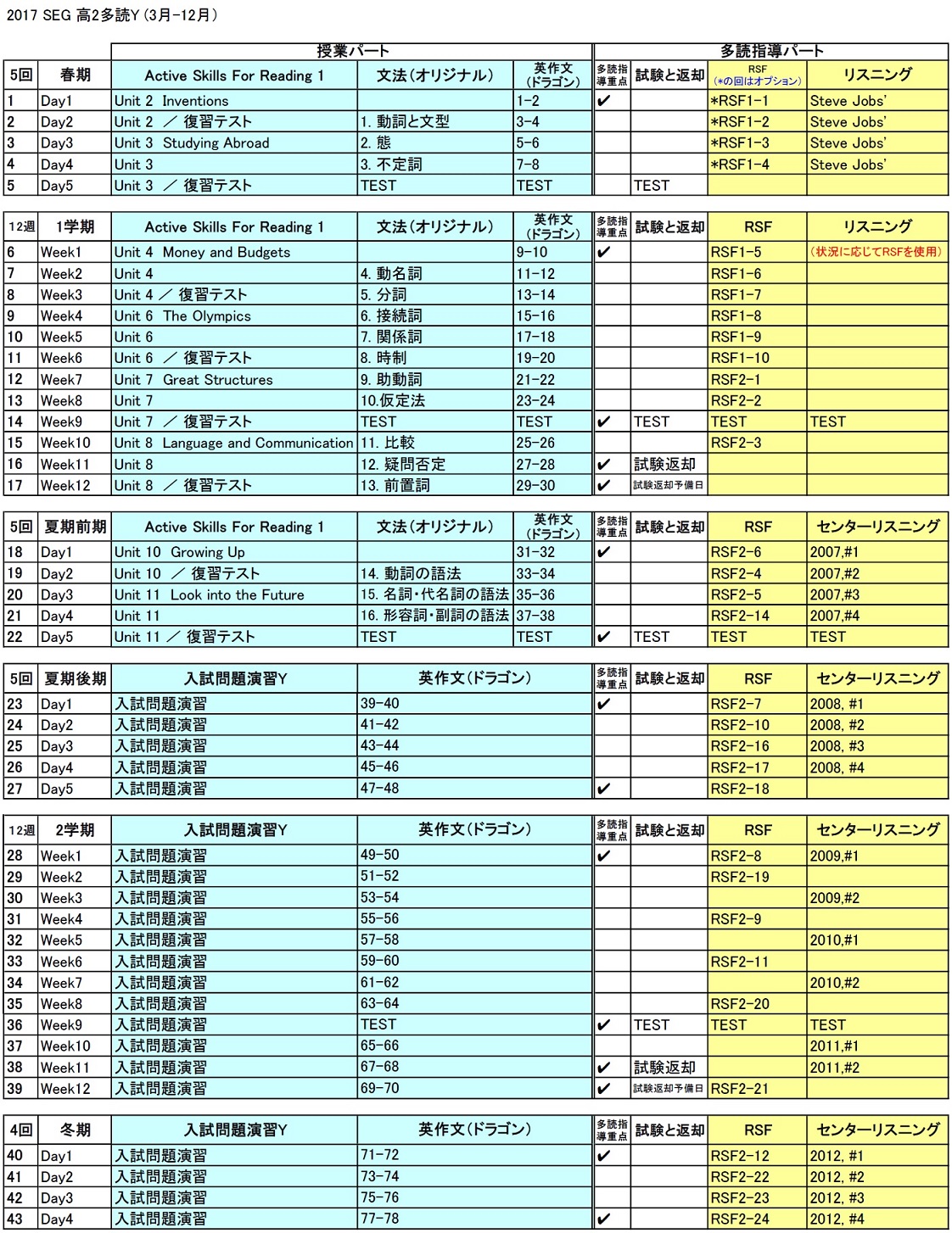 高2英語多読YZクラス 進度予定表