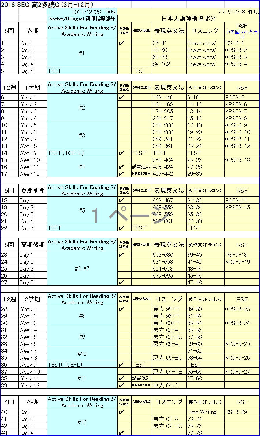 高2多読Y進度予定表