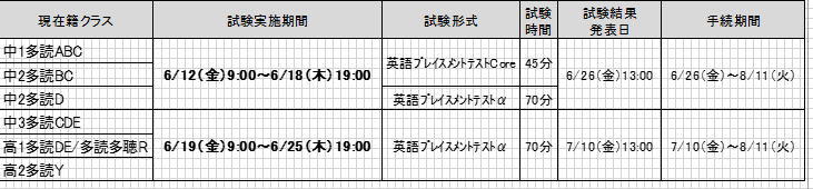 (2) 中1ABC、中2BCクラスは、英語運用能力検定協会の行う、英語プレイスメントテストCore(45分)を用います。