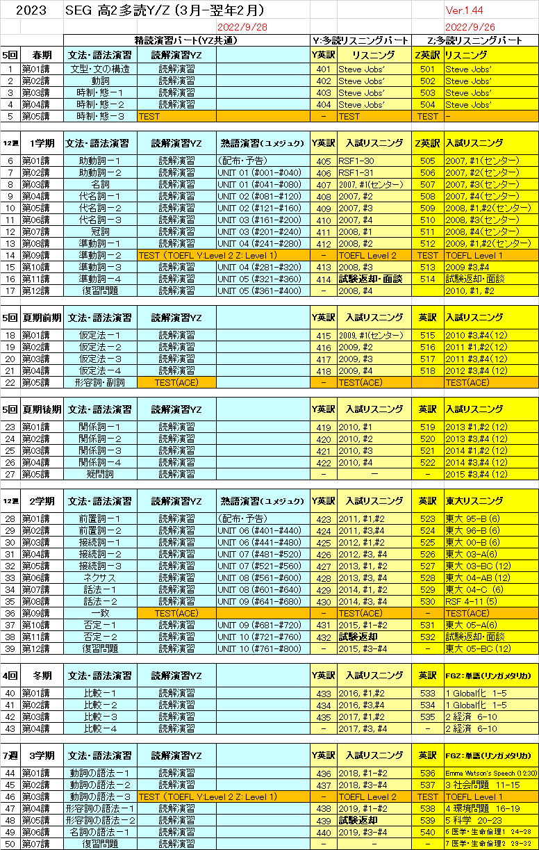 高2では、 「準受験」学年として、4月から、各クラスの実情に応じて、「入試リスニング」、「単語・熟語チェック」・「文法・語法チェック」・ 「和訳」・「英訳」を行います。 高2多読YZの進度表 高2多読のページに戻る 高2多読FG進度予定表 高2多読YZ進度予定表 多読のトップページへ