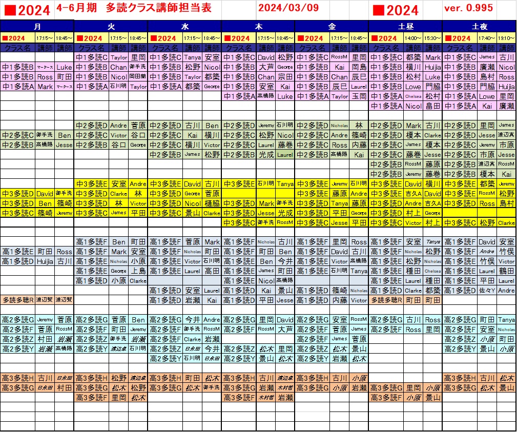クラス分け試験の結果を反映し、一部クラス編成に変更がありました。今後も、クラス分け試験・入会試験の結果により一部変更されることがあります。