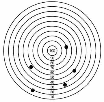 In this study, elementary school students threw a tennis ball at a target laid on the floor. They threw the ball from three throwing locations at distances of 3, 4, and 5 meters from the target. The target consisted of the center (20 cm wide) and nine larger outer rings. They served as zones to indicate the accuracy of the throws. If the ball landed in the center of the target, 100 points were given. If the ball landed in one of the outer zones, 90, 80, 70, 60, 50, 40, 30, 20, or 10 points were recorded accordingly. If the ball landed outside of the target, no points were given. If the ball landed on a line separating two zones, the higher score was awarded.