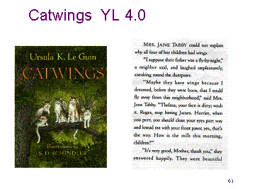 | →羽の生えた子猫の物語。意外と難しく感じる人が ある反面、魅力的なイラストにひきこまれ、レベル2 くらいの段階で読めてしまう人も。素敵なお話です。 |