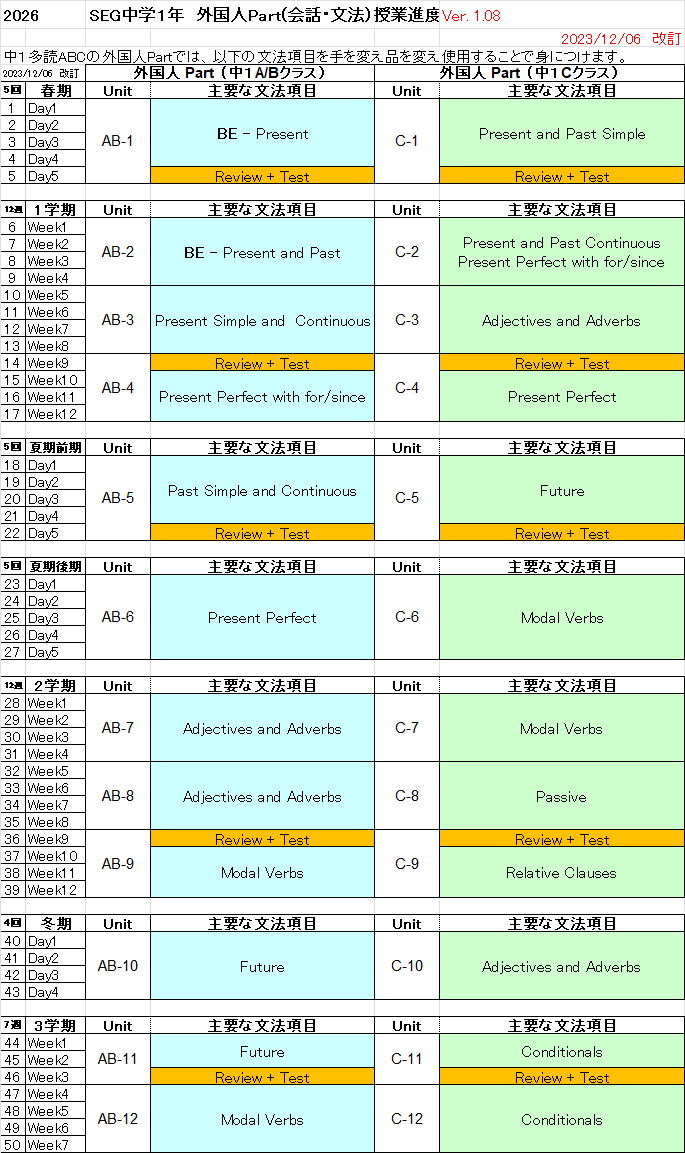 中1多読外国人授業パート進度予定表 2025の進度表はこちら 多読パートの進度表はこちら Cクラス B・Aクラス