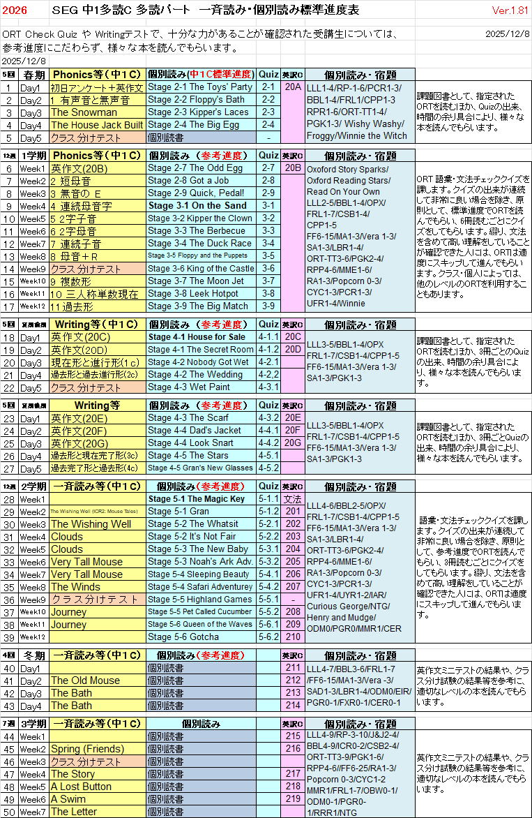中1多読Cクラス 多読パート進度予定表