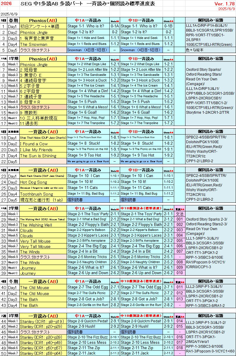 中1多読ABクラス 多読パート進度予定表