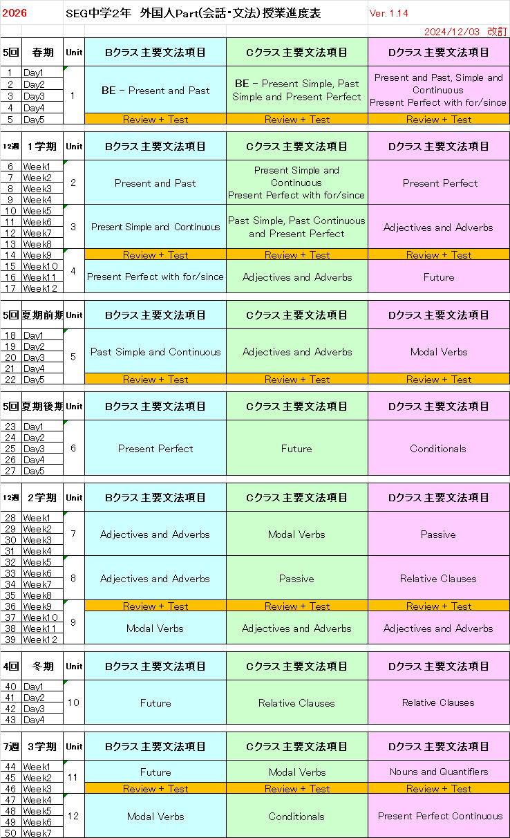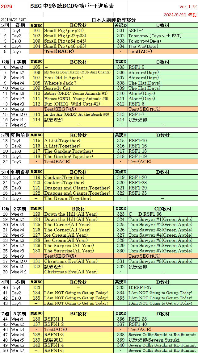 【中2クラス進度予定表】 日本人多読講師担当進度表はこちら